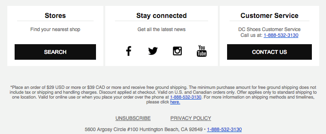 Não despreze o rodapé de um email. Os rodapés são importantes, pois ajudam a proporcionar uma ótima experiência para o usuário. Eles devem conter informações para contato, endereço da empresa, link para o seu site, links para as redes sociais, link para cancelamento de inscrição e direitos autorais.