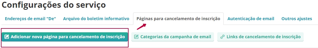 Para criar sua própria página de cancelamento de inscrição, vá para "Configurações do serviço → Páginas de cancelamento de inscrição → Adicionar uma nova página de cancelamento de inscrição".