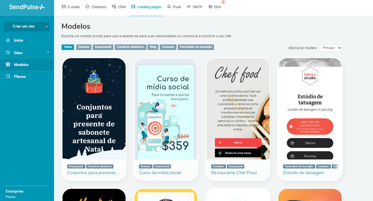 Seu site é a vitrine da sua marca na internet, portanto, ele deve ser profissional, atraente e funcional. Além disso, ele deve conter informações relevantes sobre a sua marca e os produtos/serviços que você oferece. Na plataforma da SendPulse, é possível criar uma landing page totalmente gratuita e com boas referências como você pode ver na imagem a seguir.