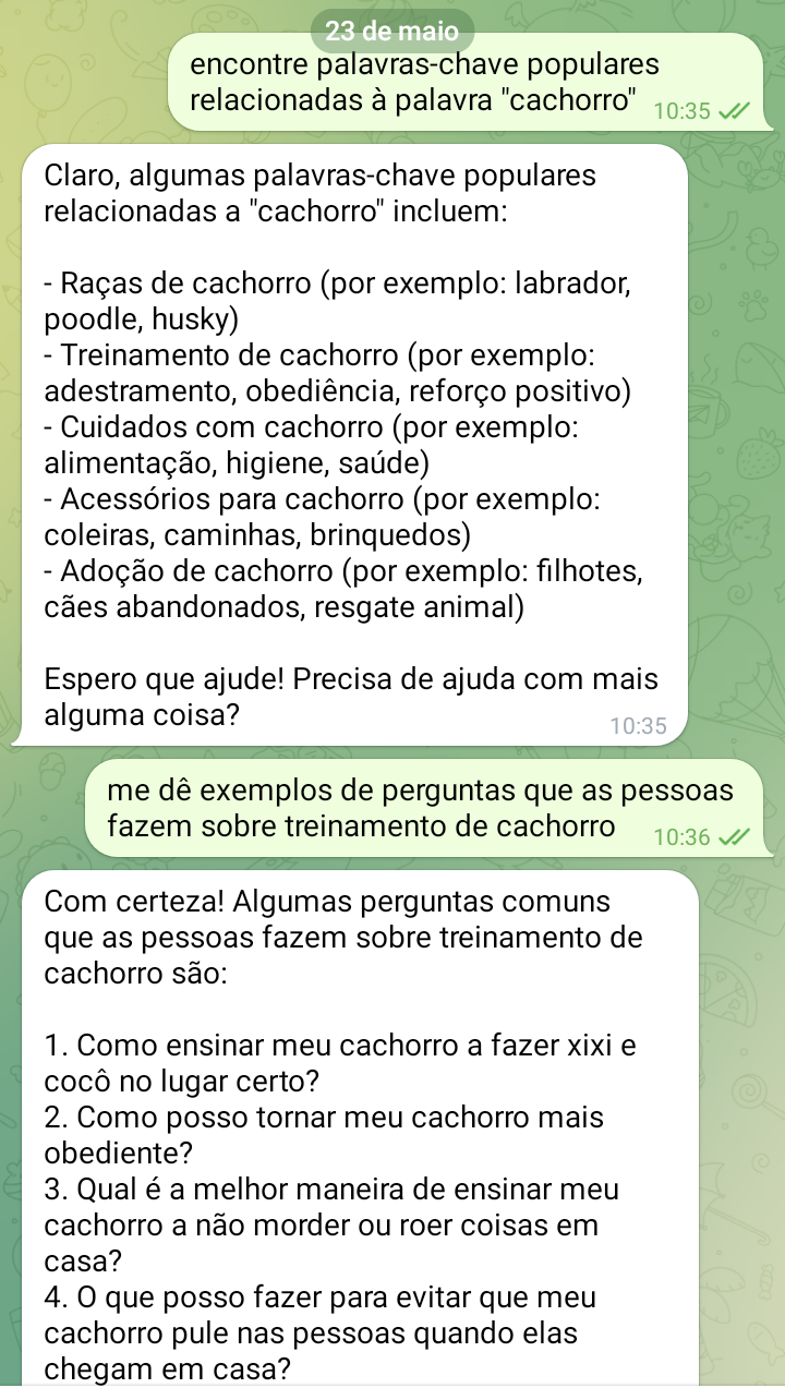 Depois de adicionar prompts ao modelo ChatGPT, o bot permite que você receba textos otimizados para SEO e obtenha palavras-chave relevantes. Assim, você pode melhorar facilmente seu conteúdo para atender aos requisitos de SEO.