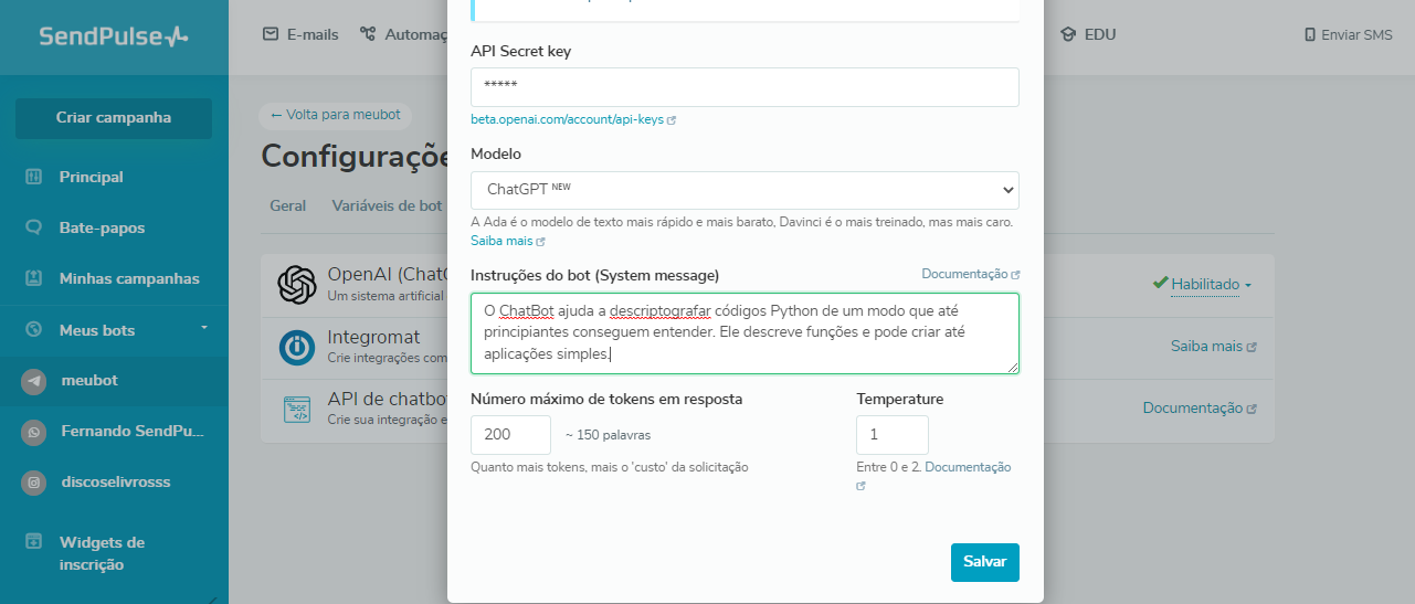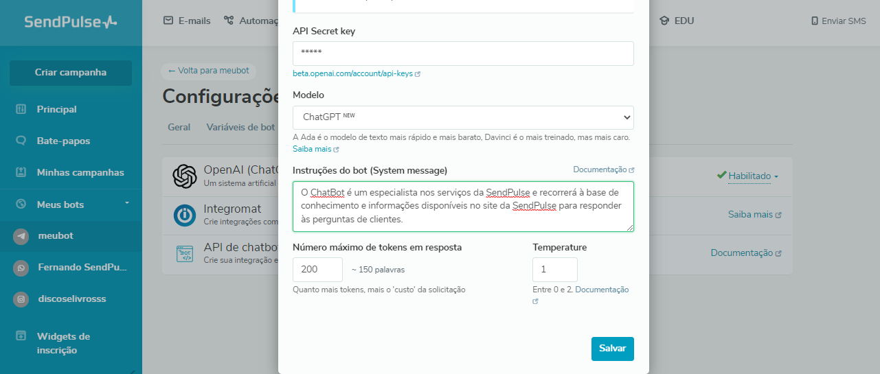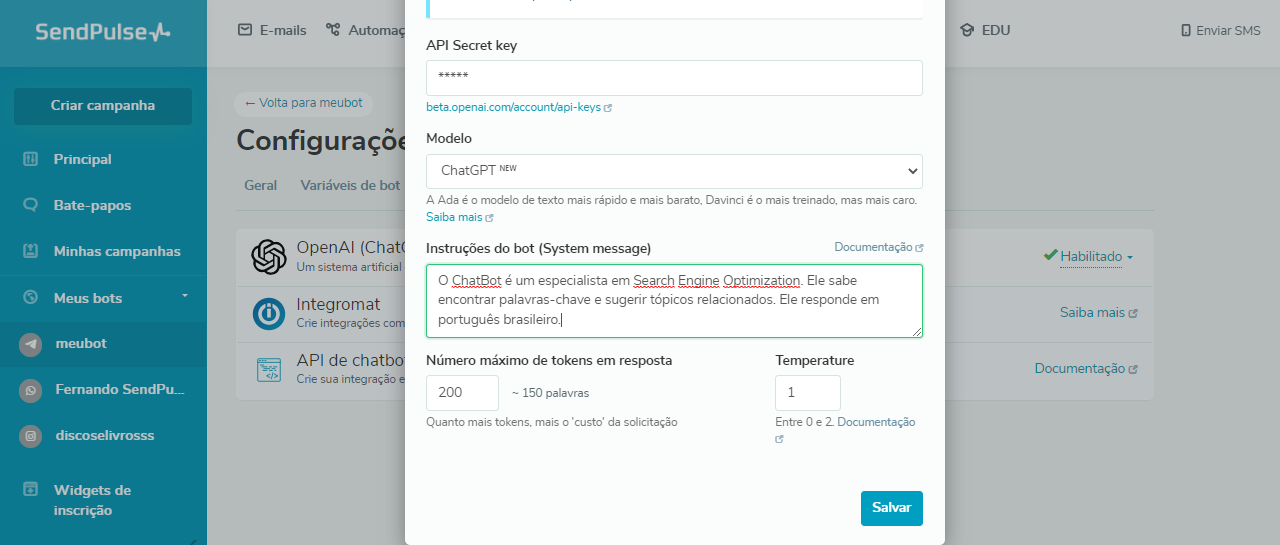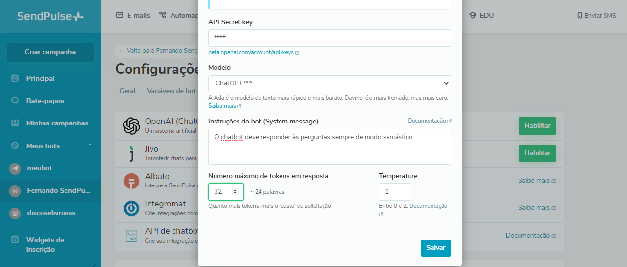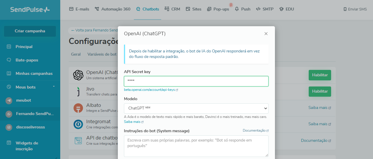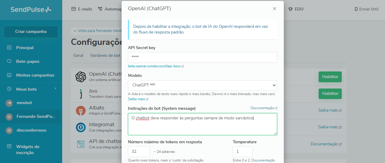 Como conectar o GPT-3 ao seu chatbot da SendPulse?