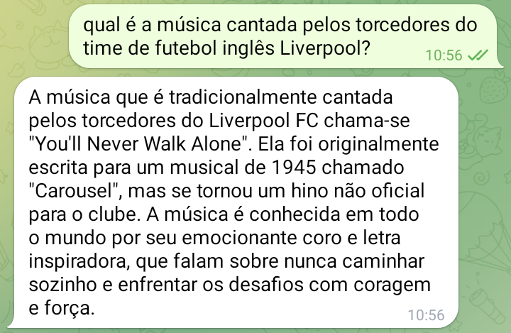 O bot é capaz de fornecer, aos usuários, fatos que podem ser encontrados rapidamente na internet. Assim, você pode criar um bot que servirá às pessoas como uma enciclopédia onde elas podem inserir a frase desejada para aprender história, fórmulas matemáticas, etc. Abaixo você pode conferir o bot funcionando com essa finalidade.