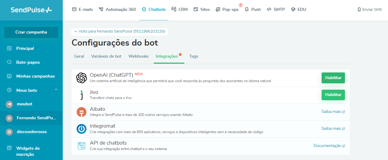 Faça login na sua conta SendPulse para configurar a integração. Selecione o bot que deseja conectar e vá para “Configurações do bot” > “Integrações”. Clique em “Habilitar” perto de OpenAI (GPT-3).
