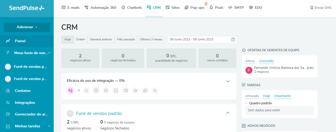 E, para gerenciar todas as suas estratégias nesses diversos canais, a SendPulse oferece um excelente serviço de CRM, que permite gerenciamento omnichannel com dashboard intuitivo e relatórios de desempenho com insights valiosos.