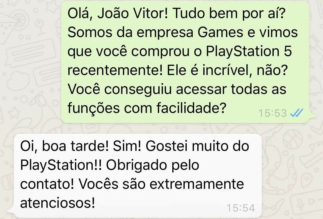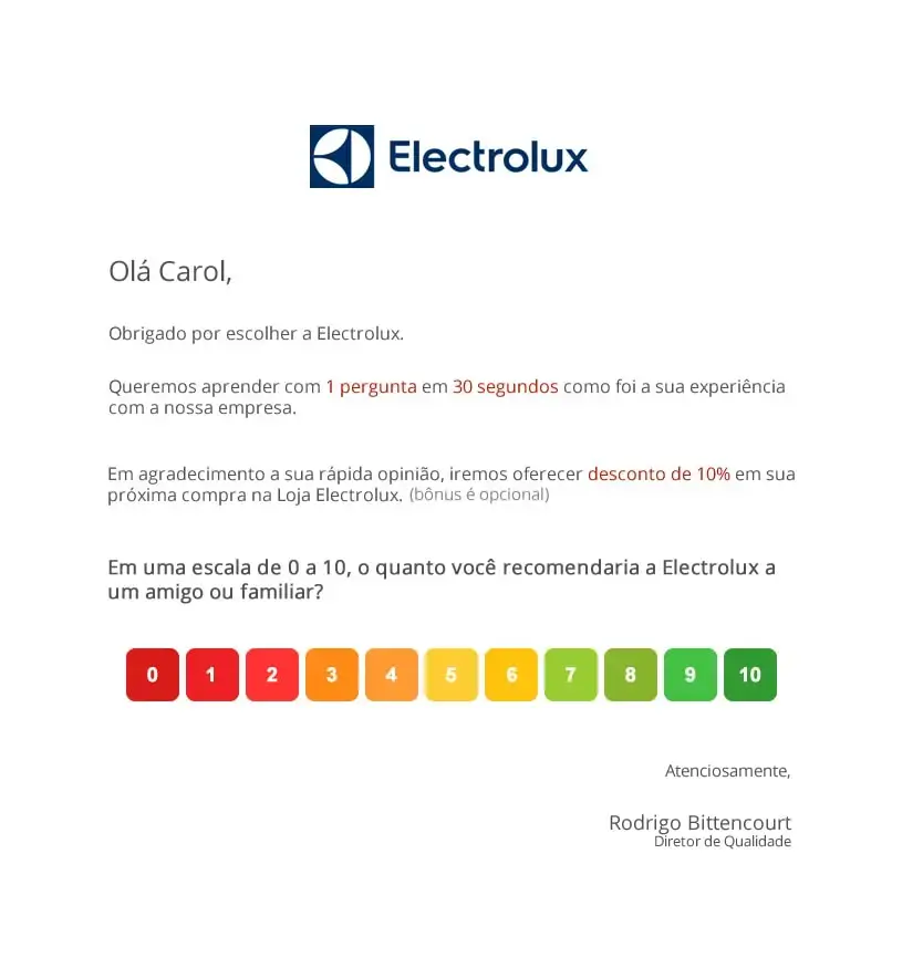 Um ótimo exemplo é dado pela empresa Electrolux, que envia mensagem pós-compra para saber exatamente qual é o nível de satisfação do cliente com o processo de compra e com o produto adquirido.