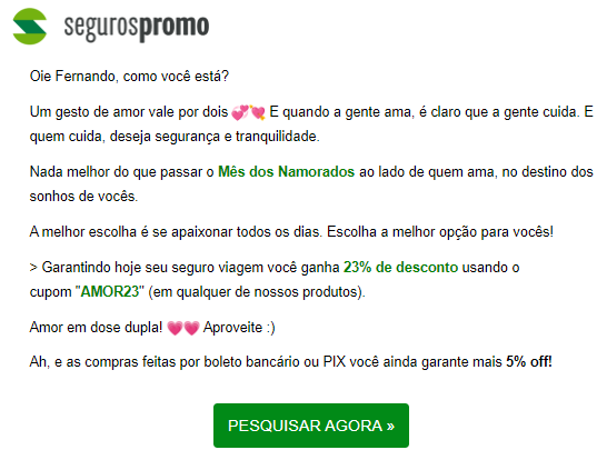 A Seguros Promo mostra como aproveitar datas comemorativas para manter contato de modo pertinente com suas listas de endereçamento. Neste caso, a empresa aproveita o Dia dos Namorados para retomar contato.