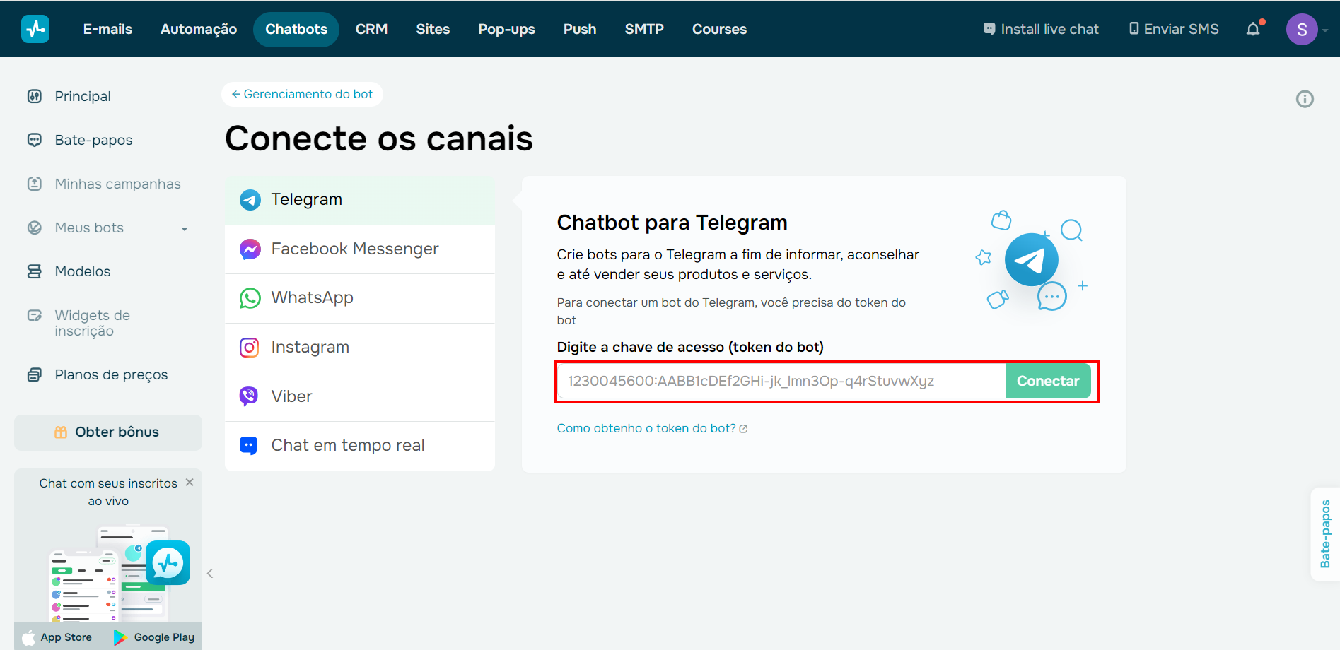 Após gerar um bot no app, você receberá uma chave de acesso. Insira esse token na plataforma da SendPulse, colando-o no local indicado na imagem a seguir. Depois, clique em “Conectar”.