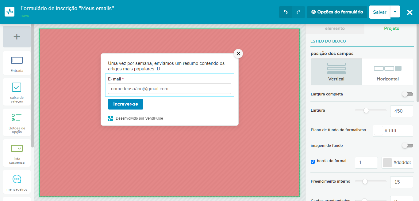 A criação de um formulário de assinatura não levará mais de 30 minutos com o Construtor de formulários de assinatura SendPulse. Você só precisa arrastar e soltar os elementos necessários para o seu formulário e desenhá-los ao seu gosto.