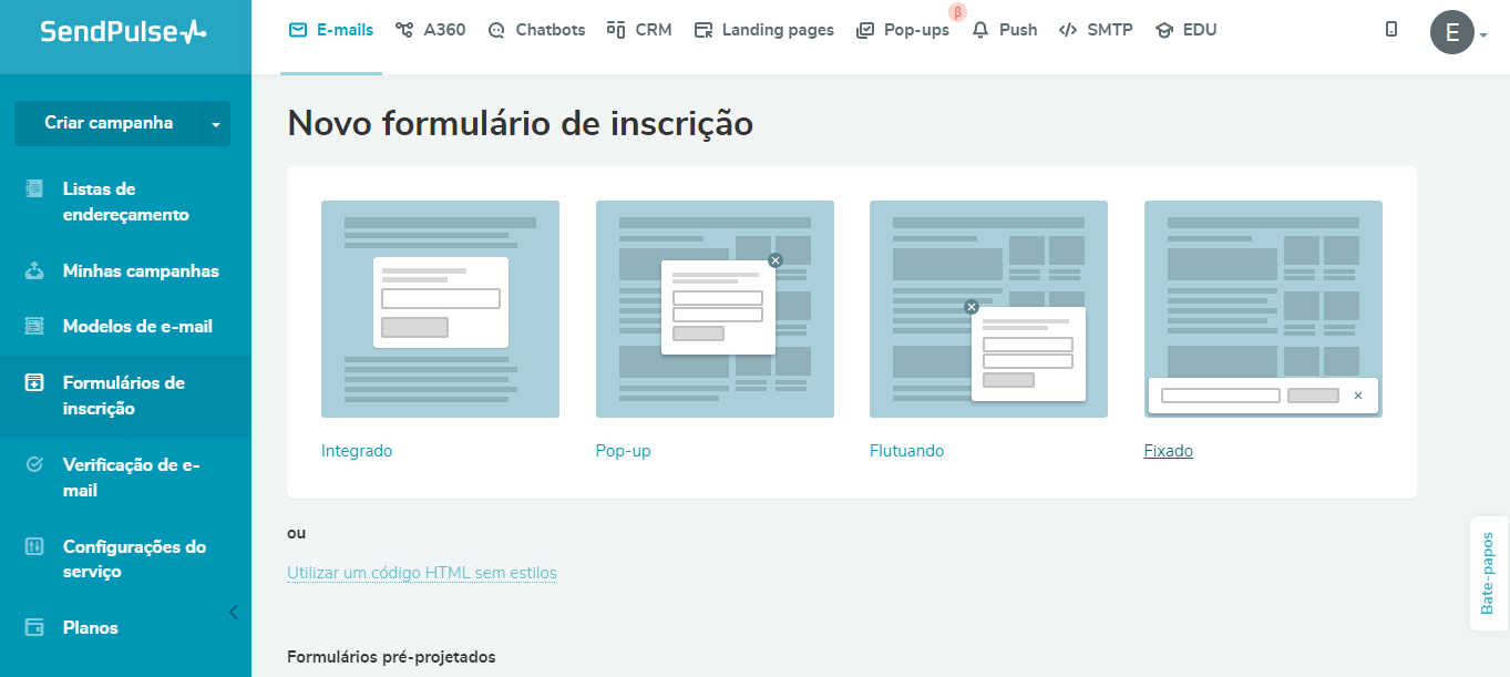 Agora que você conhece as peculiaridades de cada método, é hora de escolher um e começar a coletar leads. Não importa qual método você goste, a SendPulse permite que os profissionais de marketing criem ambos os formulários sem nenhuma habilidade técnica gratuitamente. Siga as instruções abaixo.