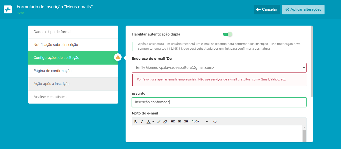 Depois disso, você pode editar o texto do seu e-mail de confirmação abaixo.