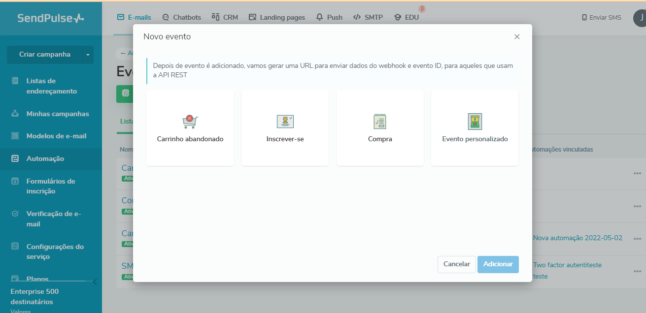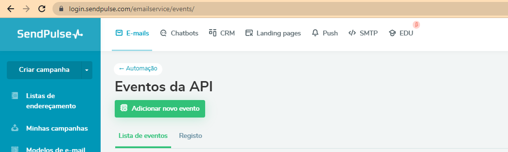 Vá em “Automações” e clique no botão “Evento de API”.