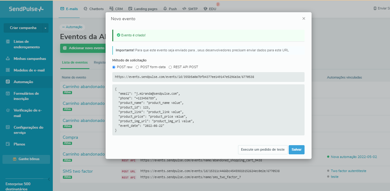 Após clicar em “Adicionar” e criar o evento necessário, nosso serviço gerará uma URL única. Peça aos seus desenvolvedores para enviar dados para esse URL.