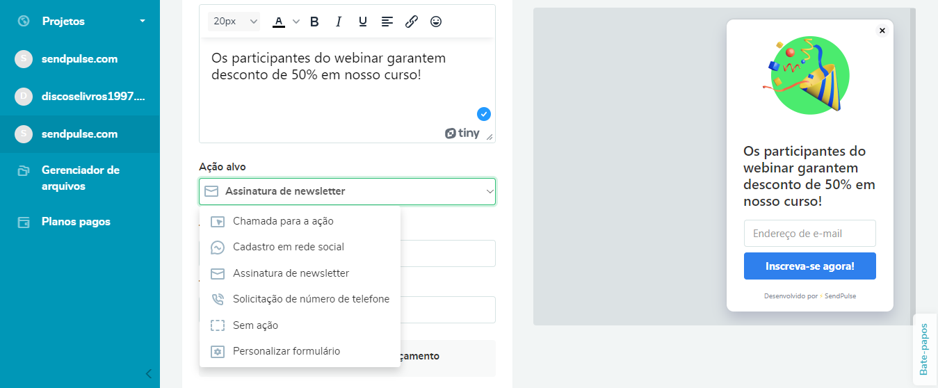 Abaixo você pode ver um exemplo de um pop-up criado na plataforma da SendPulse.
