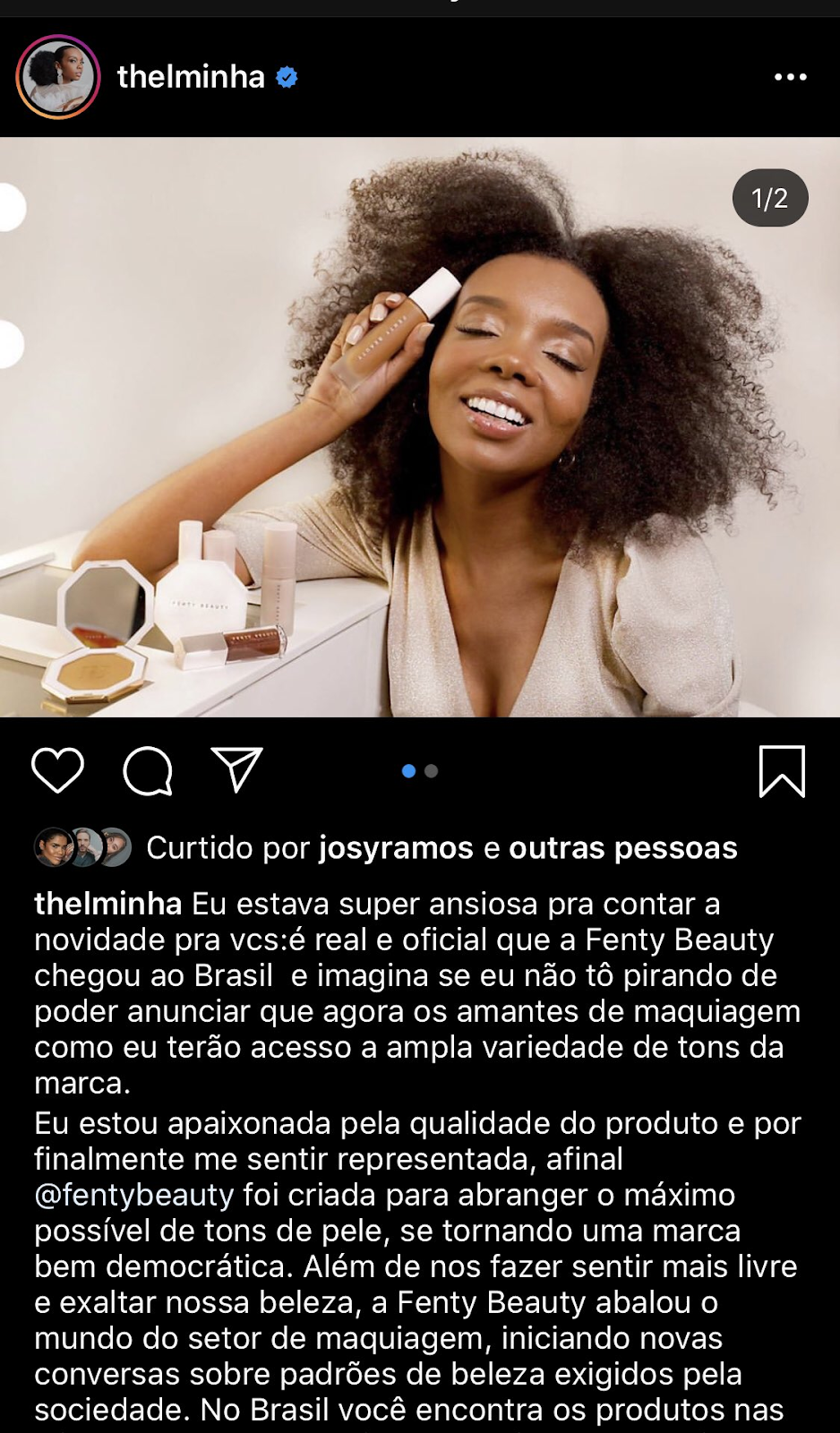 No exemplo abaixo, a marca de maquiagem Fenty uniu forças com Thelma, que tem mais de 200 mil seguidores. A blogueira tirou uma foto de si mesma usando a maquiagem da marca e apresentou a conta da empresa na legenda.