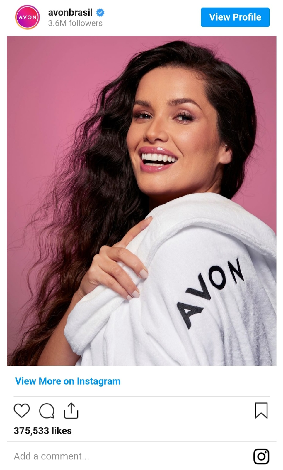A marca de maquiagem, Avon, trabalha com uma extensa rede de embaixadores e os apresenta em suas contas de mídia social. No exemplo abaixo, você pode ver um banner de Juliette no perfil do Instagram da empresa.