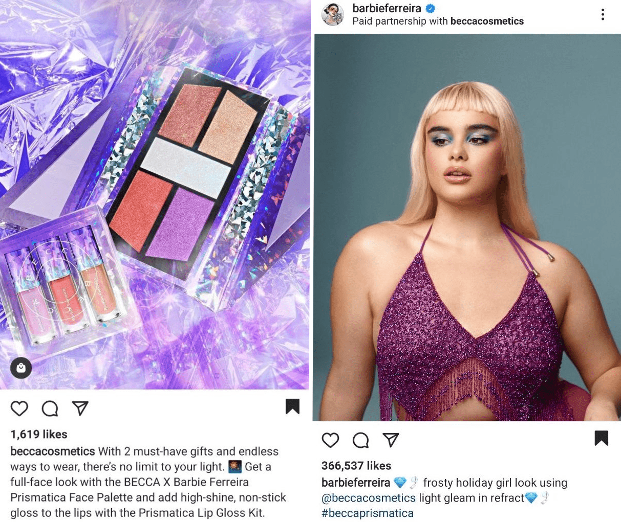 Em 2020, a BECCA Cosméticos uniu forças com Barbie Ferreira, que tem 2,3 milhões de seguidores. Juntos, a marca e a influenciadora produziram uma coleção de cosméticos chamada Prismatica. Ambos os lados dessa colaboração promoveram o produto em sua plataforma repetidamente e de forma consistente. No exemplo abaixo, a BECCA Cosmetics mostra o produto em sua conta, enquanto a Barbie demonstra os looks de maquiagem feitos com a paleta em seu perfil.