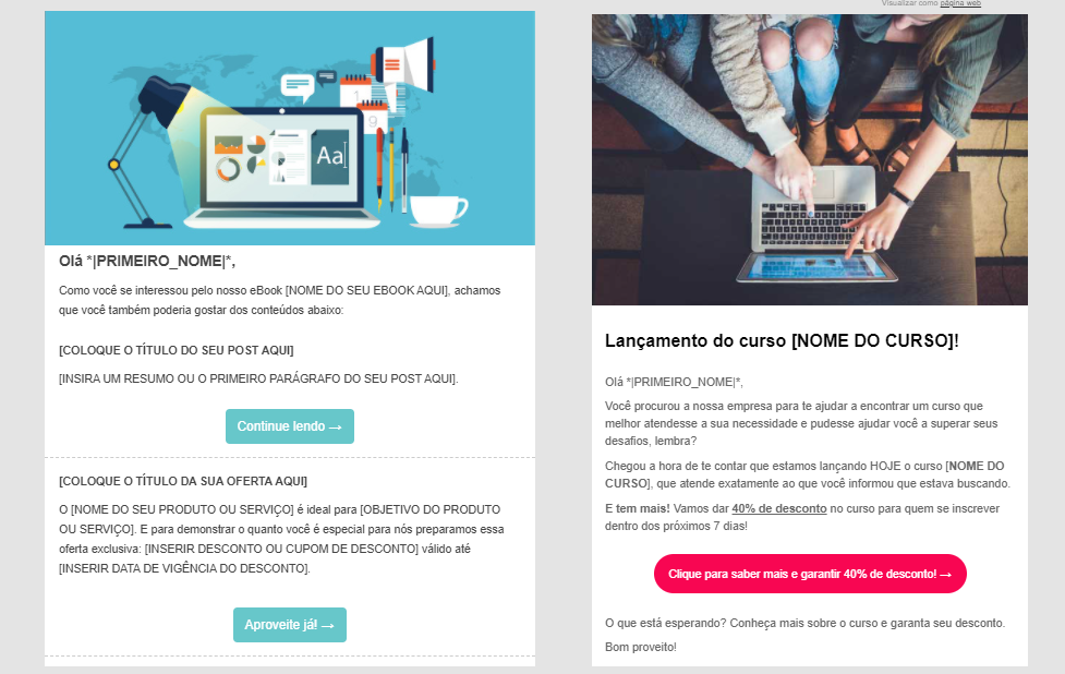 Na imagem abaixo temos dois exemplos de e-mail marketing que estão disponíveis no site da SendPulse, são fáceis de preenchimento para cada caso que se deseja no lead magnet.