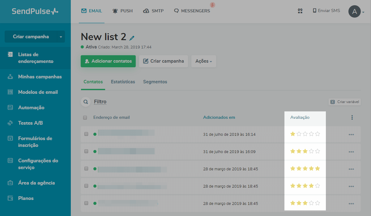 Se você enviar campanhas de e-mail com a SendPulse, poderá pontuar seus leads por classificação e atividade. Nosso serviço atribui automaticamente aos assinantes uma pontuação de 1 a 5 com base no engajamento de seus leads nos últimos 60 dias. A pontuação é influenciada pelo número total de campanhas enviadas para um determinado lead, a taxa de abertura e a taxa de cliques para determinado usuário.