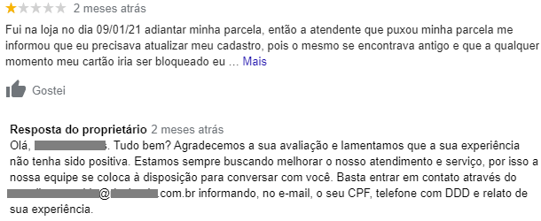 Um exemplo de “ganho rápido” pode ser responder a uma avaliação negativa, como vemos no exemplo a seguir. Não vai demorar muito, mas uma resposta bem elaborada pode impactar positivamente a sua presença online. A resposta que vemos na imagem mostra a atenção da empresa em entender melhor o problema do cliente e prestar a assistência necessária.