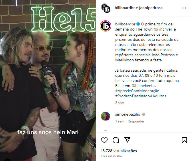 Na imagem abaixo, temos um case perfeito de marketing de influência. A parceria entre o festival de música The Town, a revista Billboard Brasil e a influenciadora digital Marimoon mostrou incrível sinergia, servindo como excelente divulgação e imersão no universo cativante do evento.