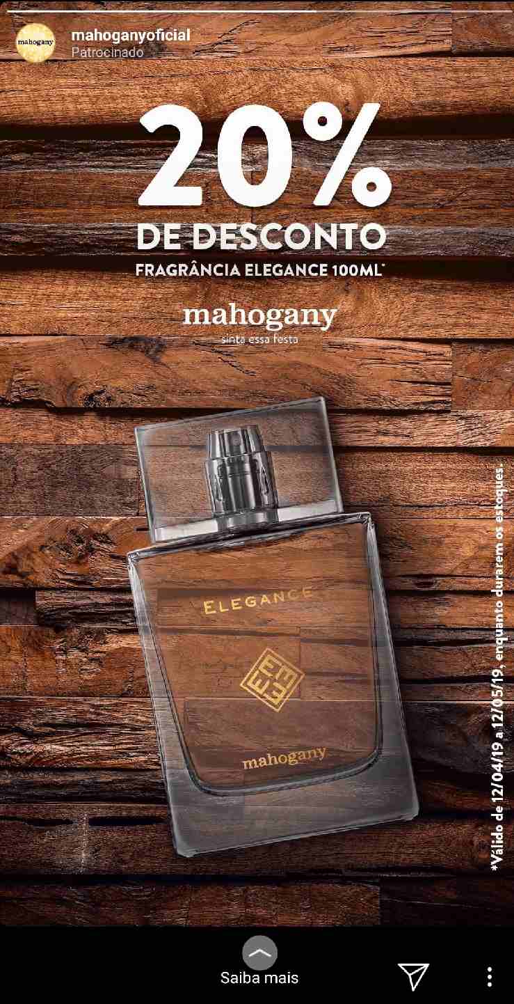 O anúncio da marca de perfumes Mahogany foi visto no Instagram, como resposta à abertura da aba de perfumes masculinos em seu site, feita alguns dias antes. Ao perceber essa atividade, a marca soube inserir, de modo pontual e ainda assim chamativo, a propaganda de seu perfume Elegance nos stories do usuário, como estratégia de retargeting.