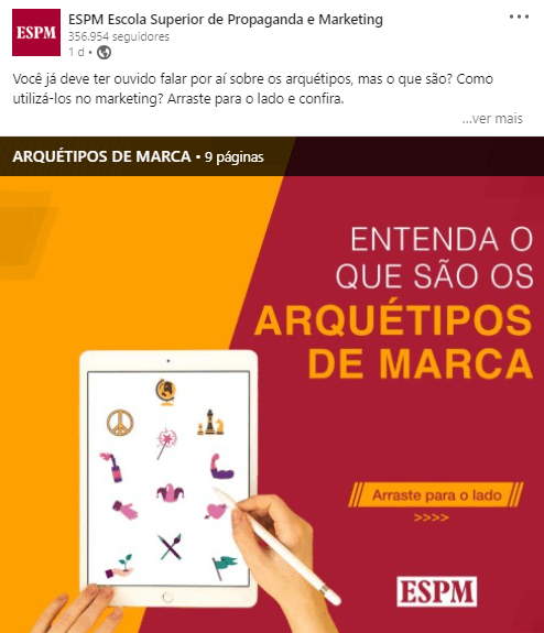 Este anúncio feito pela ESPM está presente no LinkedIn. Ele foi visto depois de buscas de materiais educativos relacionados ao uso de arquétipos de marca. Assim, os serviços de análise da faculdade conseguiram verificar a pesquisa e oferecer conteúdo direcionado para trazer o usuário de volta a ela e poder, então, promover seu material sobre o assunto.