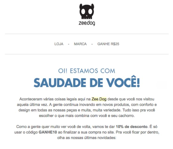 A Zeedog usa uma palavra muito comum para os brasileiros que é a saudade, trazendo assim uma proximidade com seu cliente inativo e garantindo uma vantagem que nesse caso é desconto na próxima compra.