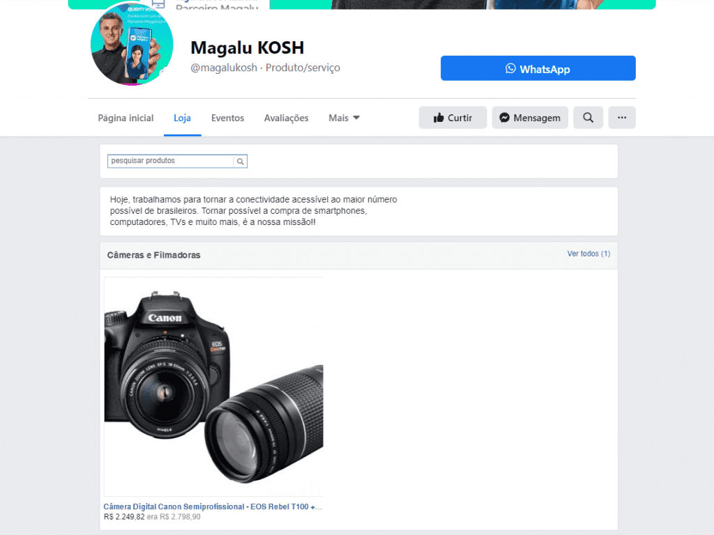 A Magalu Kosh traz um ótimo exemplo de comércio social feito no Facebook. A marca, que anuncia seus produtos via Magazine Luiza, utilizou os recursos disponíveis na plataforma para apresentar seu catálogo de produtos e os detalhes de cada item, permitindo que a compra fosse efetuada ali mesmo, sem que o usuário precisasse deixar o Facebook.
