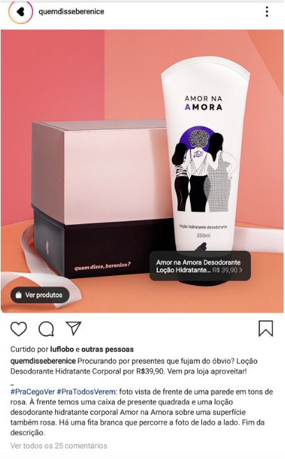 Já a marca Quem disse, Berenice? mostrou aptidão no uso de recursos de comércio social do Instagram. A marca fez um “post comprável” que, ao ser tocado pelo usuário, mostra o preço do produto, oferecendo a possibilidade de ir à página que contém maiores detalhes, ainda dentro do Instagram.