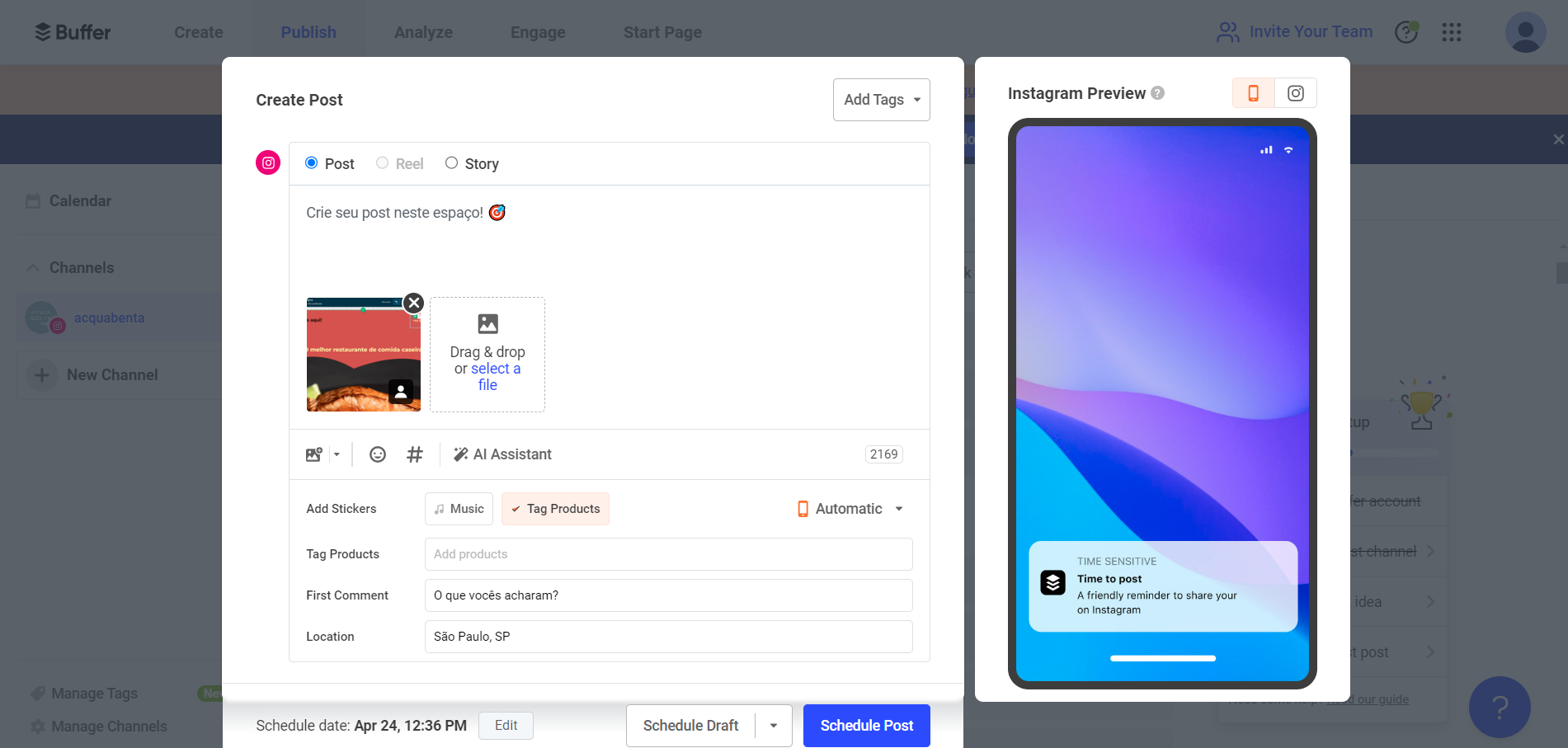 Na área de composição, você consegue criar seu conteúdo, adicionando fotos, textos, emojis e até hashtags sugeridas pela ferramenta. Alguns recursos interessantes dessa aba são: