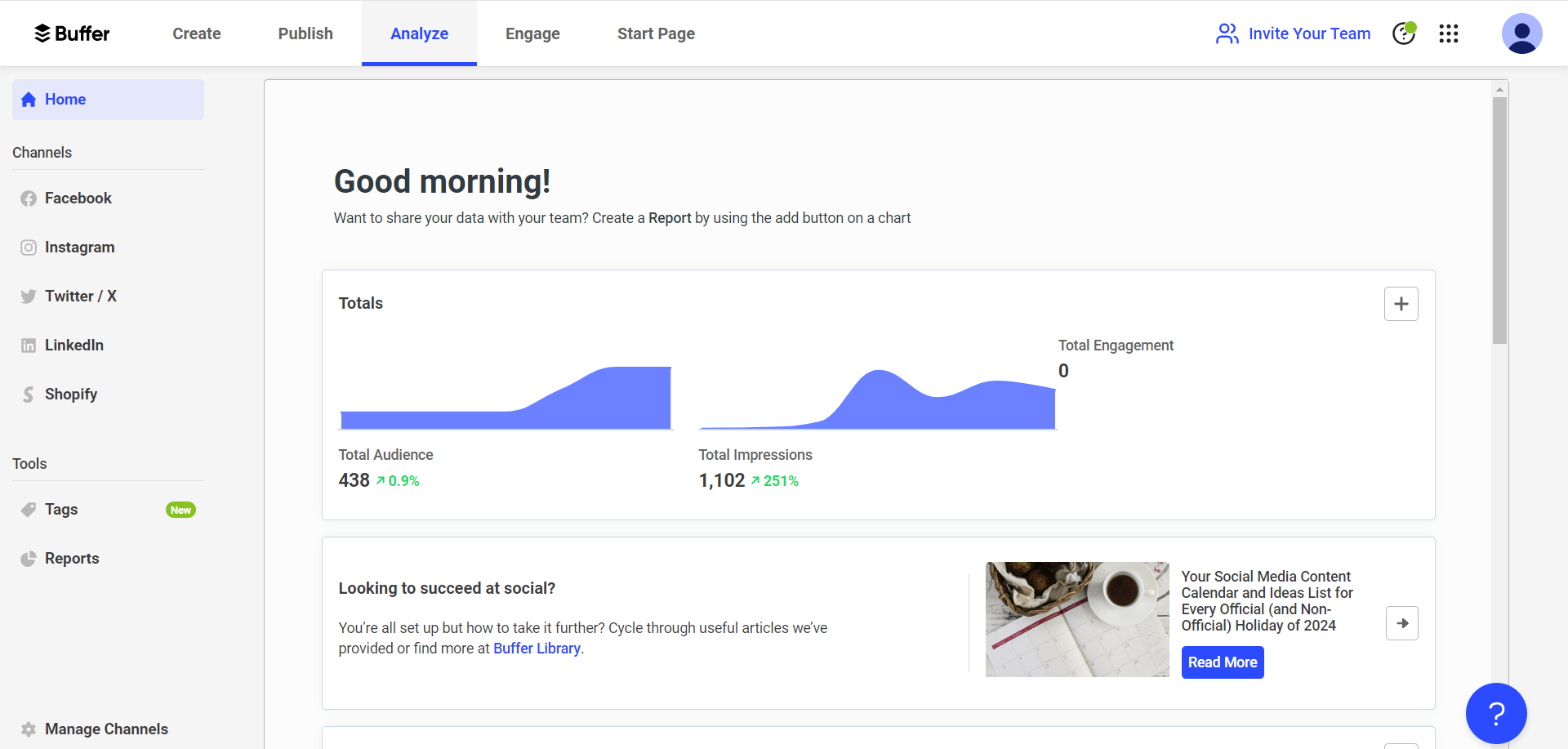 A ferramenta Buffer é uma ótima solução para gerenciar seus canais de comunicação digitais, como Instagram, LinkedIn, TikTok, YouTube, Facebook e X. Com ela, você consegue organizar suas publicações, analisar resultados e engajar seus seguidores.
