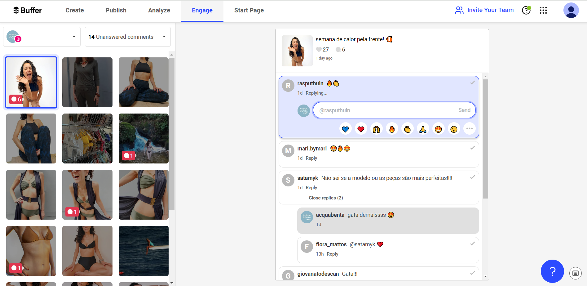 Por último, na aba de engajamento, você pode ver os comentários dos seus seguidores em cada uma das redes sociais. A ferramenta avisa caso haja comentários não respondidos nas suas publicações, mostrando a quantidade e quais são para que você responda a todos diretamente por essa janela. Isso facilita e agiliza seu trabalho.