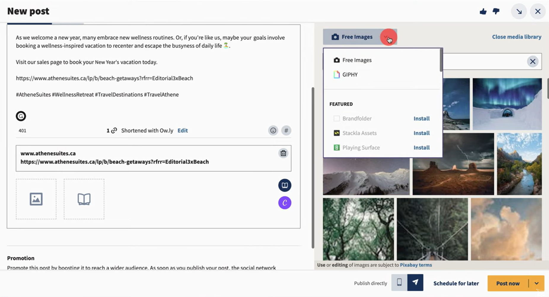 Dentro da plataforma, você pode criar seu conteúdo, incluindo textos, imagens, vídeos e hashtags, e selecionar em quais contas ele será publicado. Durante o processo de criação, a ferramenta mostra, em uma janela lateral, a disposição de todos os elementos do seu post para uma visualização prévia do resultado. Além disso, por meio de uma integração, é possível criar designs no Canva e transferi-los diretamente para sua ferramenta de gestão.