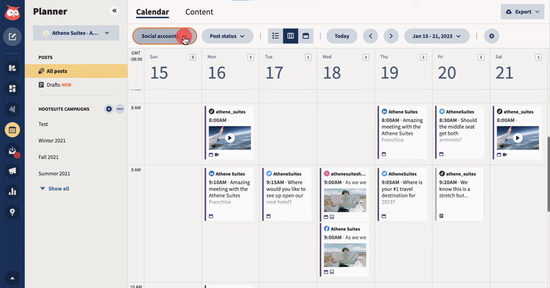 Há também um recurso para escolher se a visualização do calendário será por dia, semana ou mês, facilitando sua organização. Ainda, com o editor de arrastar e soltar, você pode facilmente alterar a data e hora de uma publicação, apenas movendo o bloco referente a ela para um novo local.