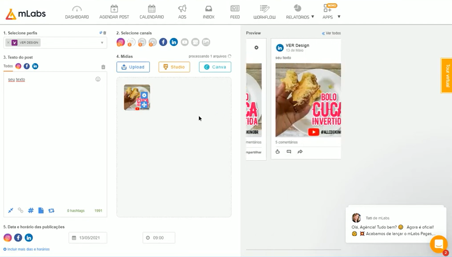 Após a criação da publicação padrão, você pode personalizá-la para cada uma das suas redes sociais, corrigindo detalhes e visualizando exatamente como o texto e as imagens ficarão dispostos. Além disso, é possível adicionar separadamente as menções aos perfis de cada uma das mídias.