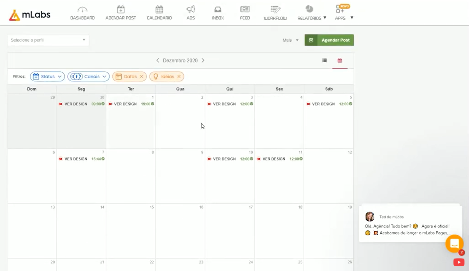 Outro recurso interessante é o calendário, onde suas publicações agendadas ficam disponíveis para visualização. Nessa área, há a possibilidade de filtrar seus posts por datas, redes sociais, ideias e status. Além disso, você consegue iniciar a produção de um conteúdo clicando diretamente no botão “adicionar” dentro da janela de uma das datas.