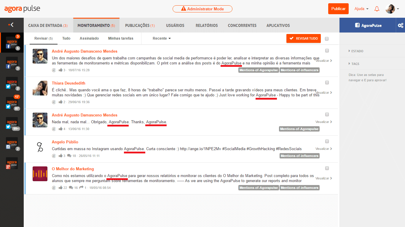 O serviço da AgoraPulse é recheado de funcionalidades para realizar monitoramento de redes sociais. Com a utilização desta plataforma, é possível gerenciar todas as mensagens das redes sociais de uma empresa, agendar e publicar conteúdo, segmentar o público-alvo, ver desempenho da concorrência, monitorar canais sociais, identificar principais influenciadores de cada nicho, analisar o ROI, ter acesso a relatórios das redes e de anúncios no Facebook.