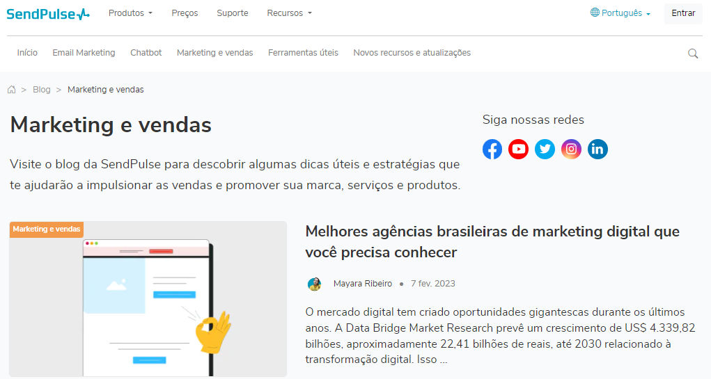 Um ótimo exemplo é o blog da SendPulse, onde você pode encontrar as melhores e mais completas informações sobre marketing, tecnologia e negócios.