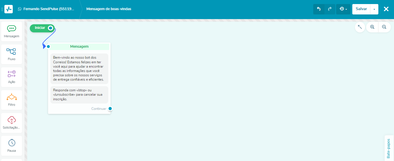 Além disso, ao integrar-se aos perfis de redes sociais dos usuários, os chatbots da SendPulse podem rastrear interações e histórico de compras, tornando possível adaptar as estratégias de targeting em tempo real para obter melhores resultados e maximizar o retorno sobre o investimento em publicidade. Abaixo, você pode conferir o processo de criação de fluxos conversacionais dos bots: