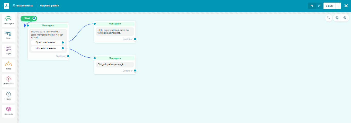 Venha promover seu webinar e divulgar as informações de cada evento com chatbots automatizados! Abaixo, você pode ver um exemplo de fluxo de convite para inscrição em webinar, feito na plataforma da SendPulse. Com ele, é possível direcionar link de inscrição aos interessados de forma prática e rápida.