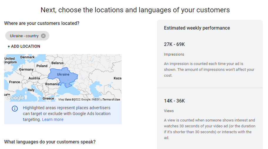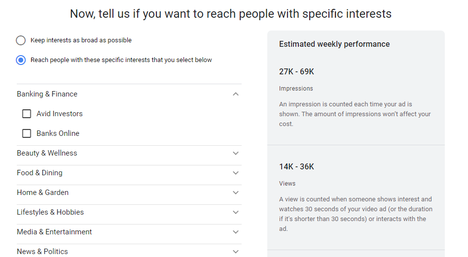Em seguida, você terá que escolher o nome da campanha, o orçamento e o valor médio que está disposto a gastar todos os dias. Identifique as datas em que o anúncio será veiculado, escolha o idioma e a localização dos espectadores que você deseja segmentar. Decida onde exibir seus anúncios e como deseja pagar por eles. Exclua o conteúdo "sensível" se não quiser que seus anúncios sejam exibidos com ele.