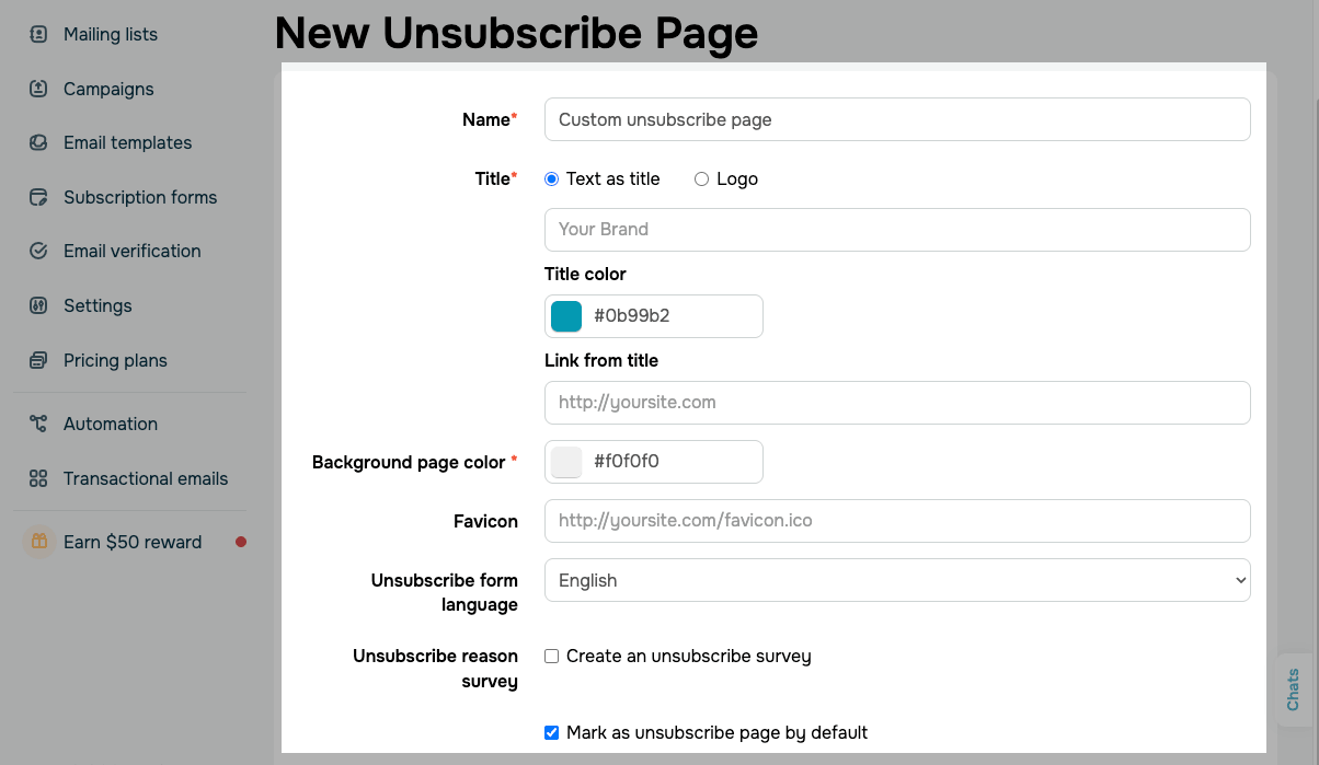 | Mark as unsubscribe page by default | Set this page as the default unsubscribe page. |