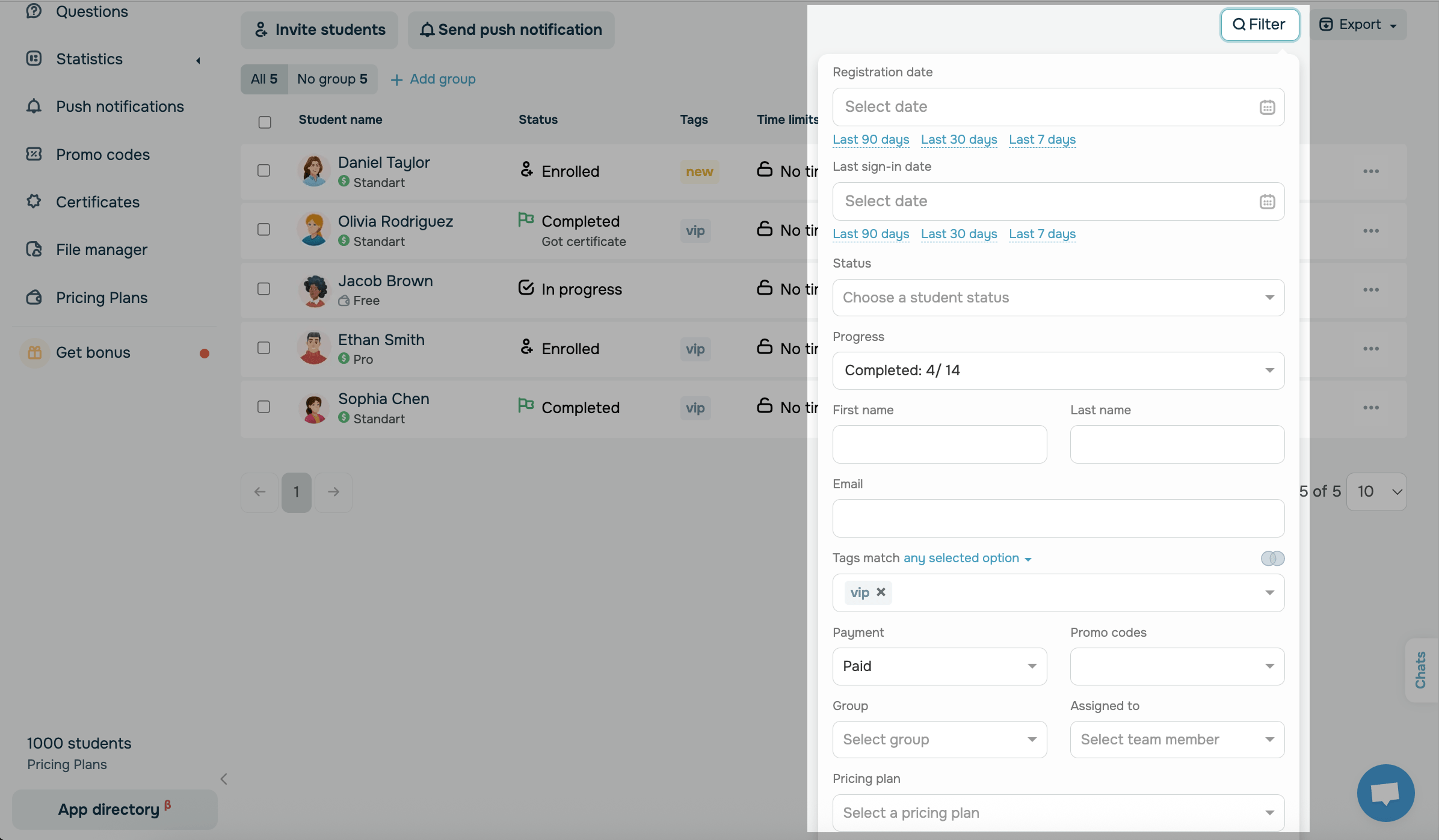 In this tab, you'll find a list of students enrolled in your course and their data, including name, progress, assigned tags, limits, and registration date.