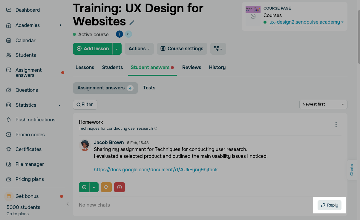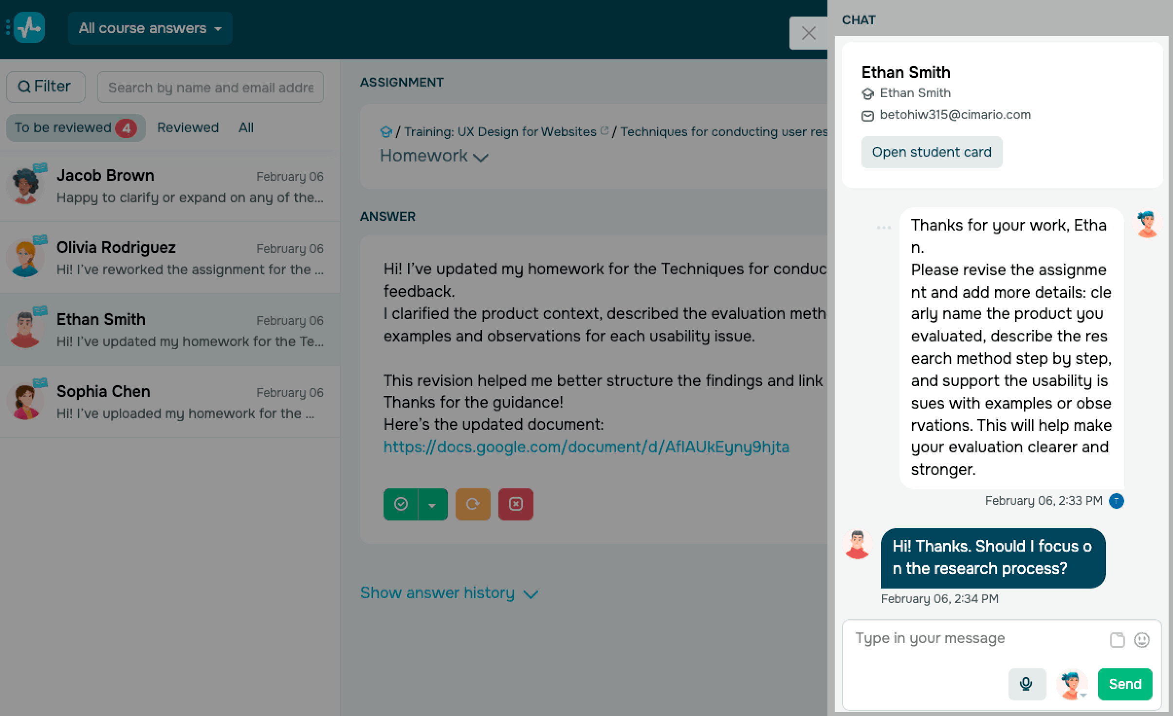 Go to student answers. You can start a chat in the Assignment answers tab or by clicking Reply in Student answers.