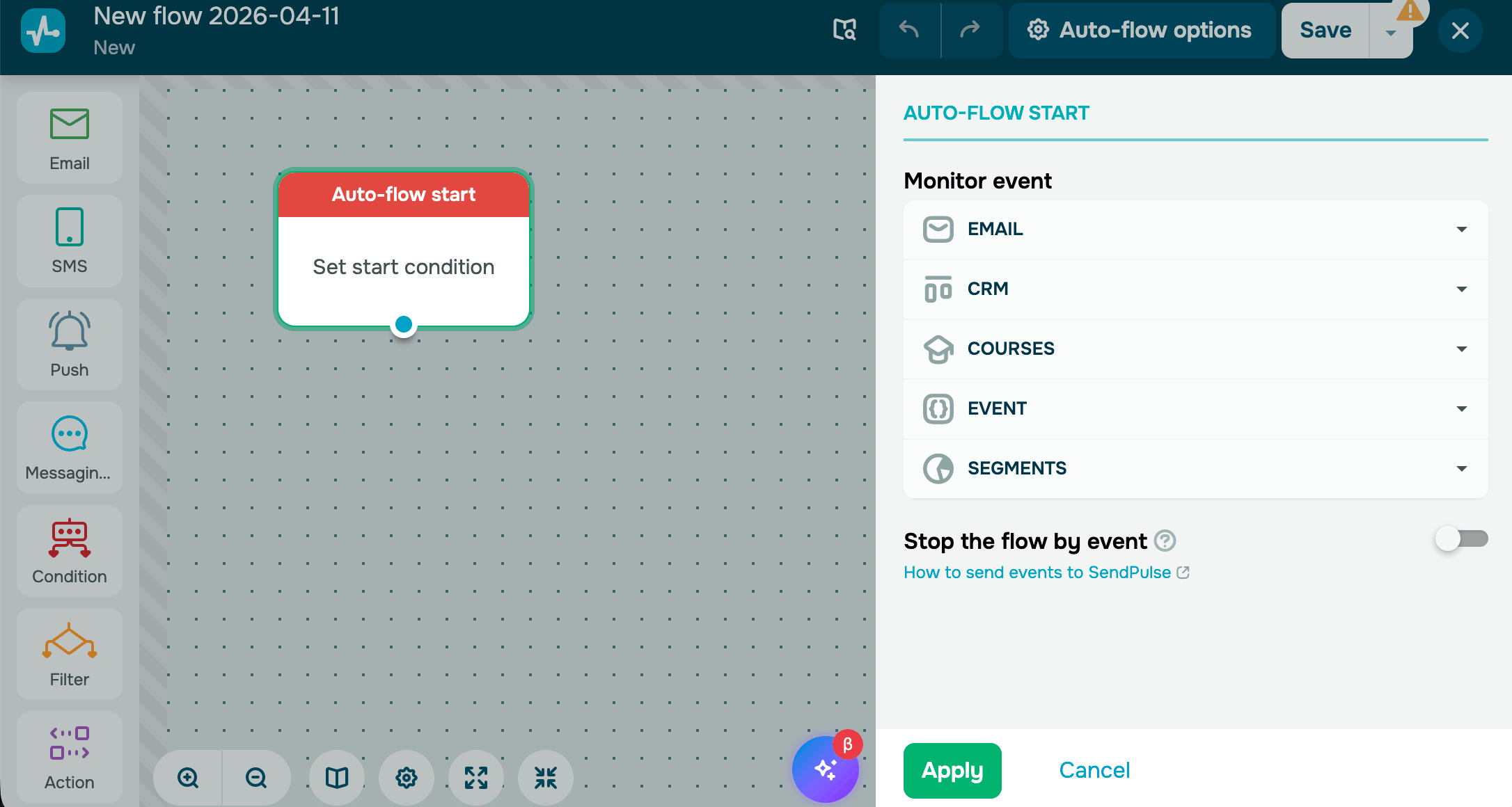 An automated flow is a sequence of elements that controls when, to whom, and how SendPulse sends messages and takes actions. You can use flows to automate welcome messages, post-purchase sequences, deal updates, course enrollments, and more.