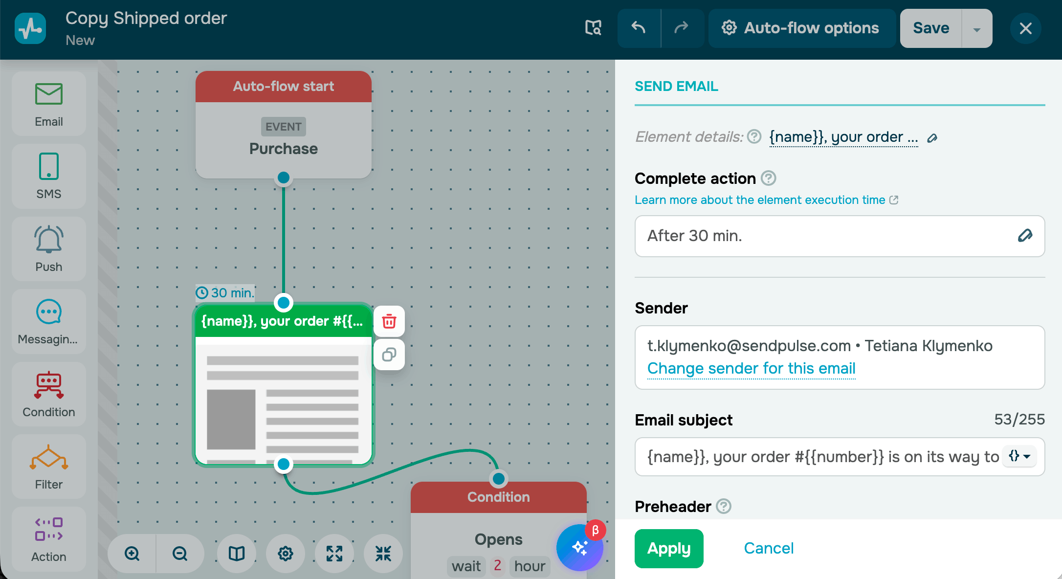 Use sending elements to contact users across multiple communication channels and send emails, SMS messages, and push notifications. Each element has its own template, sender settings, and delivery time.