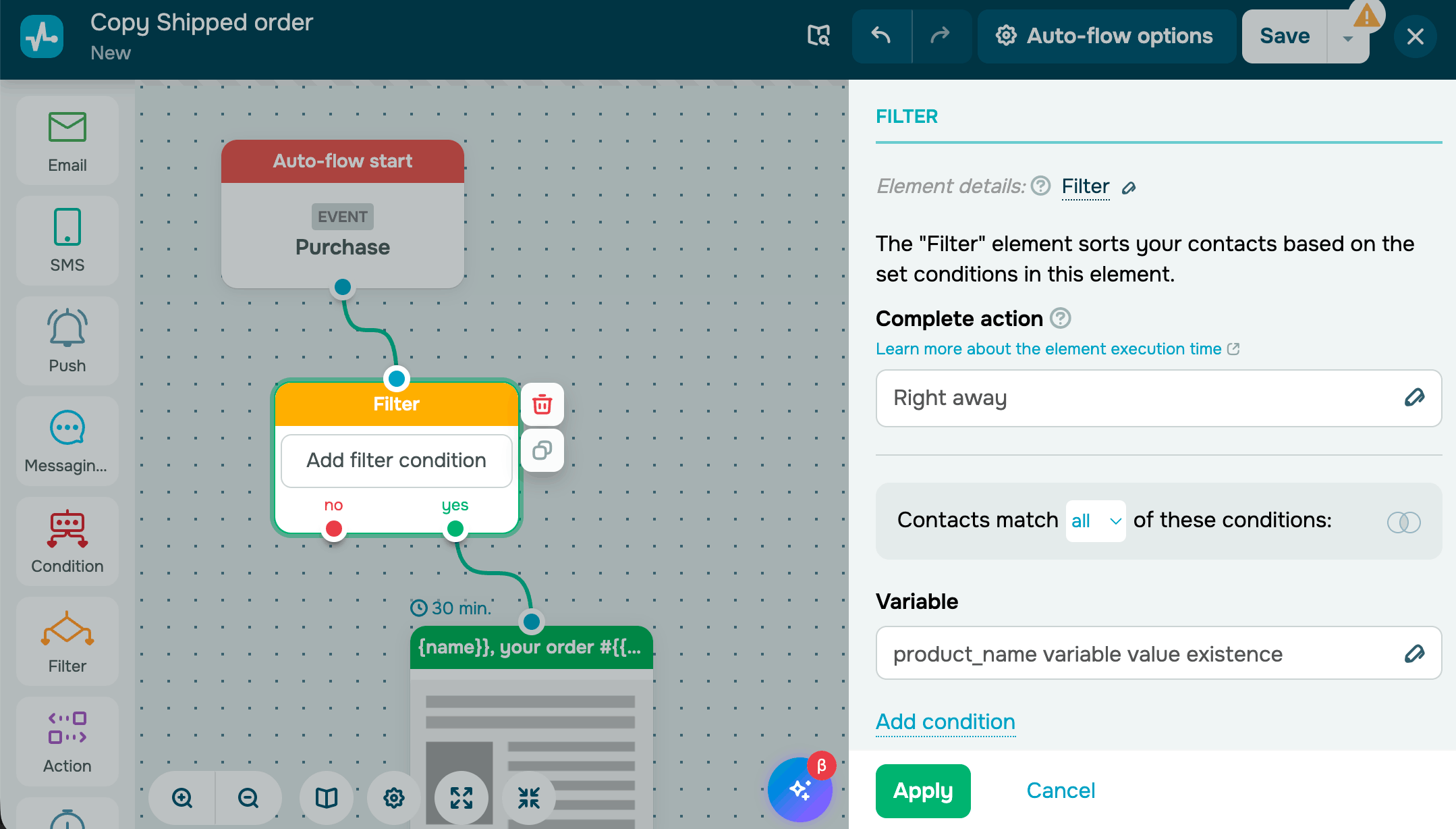 The Filter element routes contacts to Yes or No based on their data, such as variable values, tags, days of the week, or other criteria.