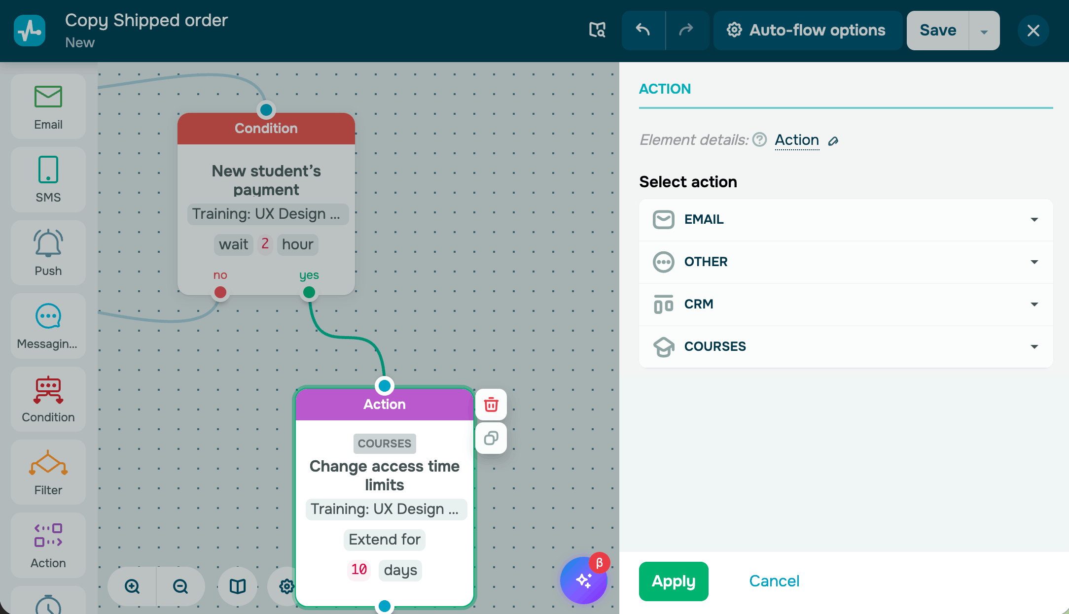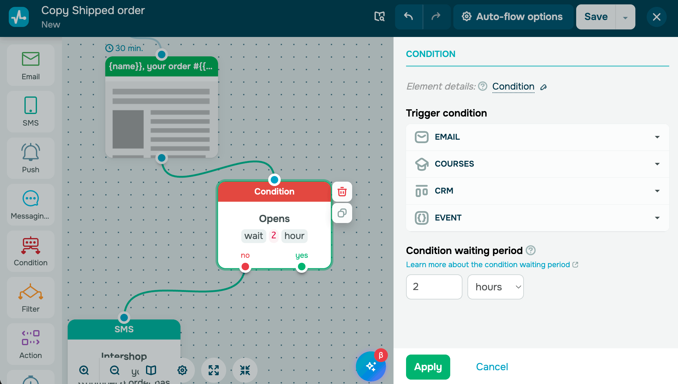 Use the Condition element when your next step depends on what a contact does after the previous step. Set a time window. The flow waits and then splits into two branches: contacts who acted and contacts who did not.