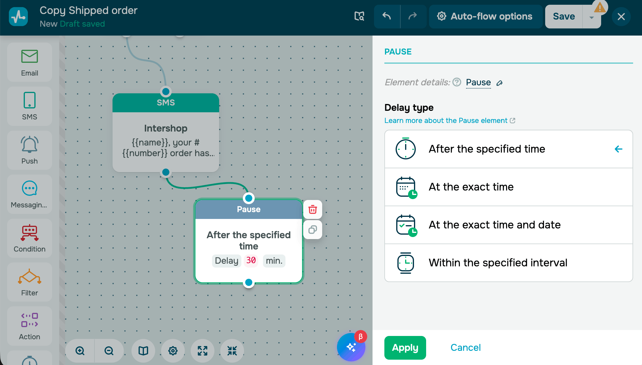 The Pause element holds a contact in the flow for a set amount of time before moving them to the next element. Use it to control the timing between messages or to delay an action until later.