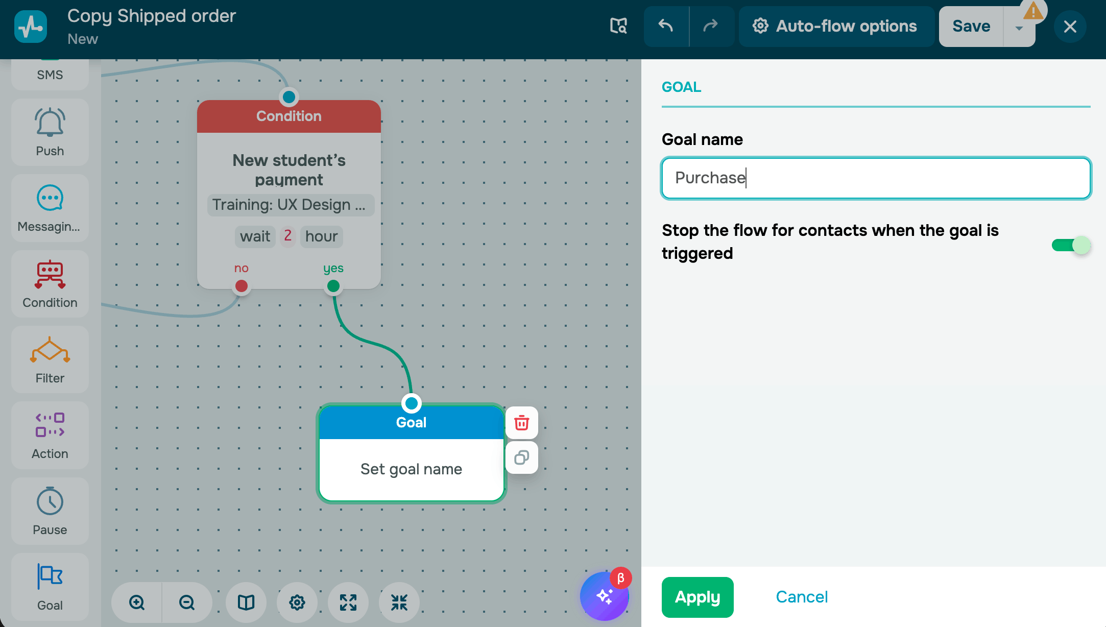 The Goal element defines a target outcome in the flow. When a contact reaches a Goal, it counts as a conversion.